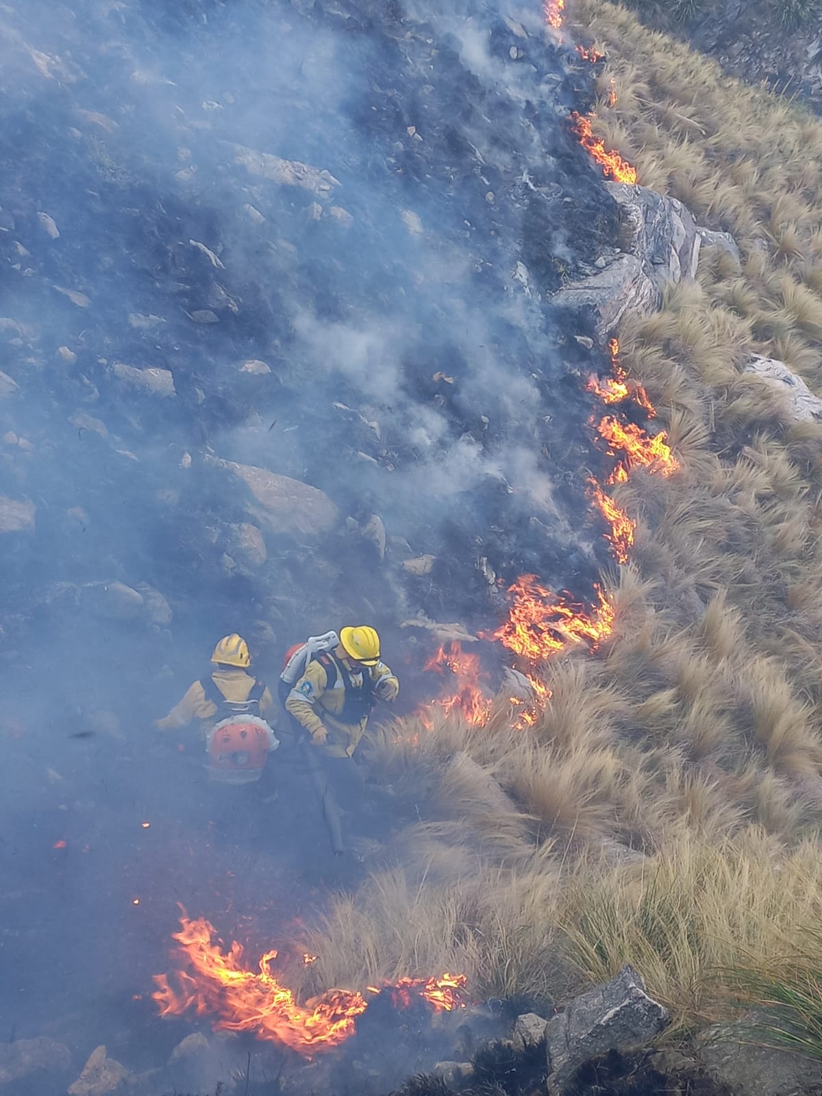 La Secretaría de Riesgo Climático informó que varias dotaciones de bomberos combaten un incendio desatado entre las localidades de El Manzano y Salsipuedes, en el sector cercano a las canteras San Cayetano.